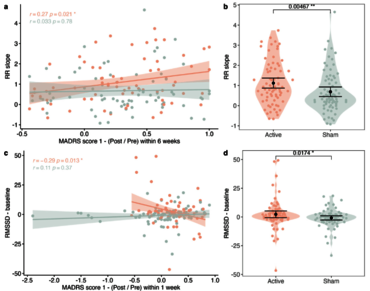 Electrocardiograms throughout stimulation monitored heart rate and ist variability, focusing on heartbeat deceleration heart rate (RR) slope and changes in the root mean square of successive differences between heartbeats (RMSSD). Findings demonstrated that a higher RR slope within the first 45 s of stimulation predicted greater clinical improvement at 6 weeks, while a lower RMSSD change during the first 270 s correlated with improvement at 1week. However, no significant differences in outcomes were observed between personalized and fixed stimulation sites. This study identified a significant relationship between early heart rhythm modulations and the antidepressant effects of accelerated iTBS in MDD. Although the spatial determination of stimulation sites did not enhance clinical improvement, iTBS-induced changes in cardiac rhythm during early sessions may develop into valuable biomarkers for stratifying patients, enabling more personalized and effective treatment strategies in the future.