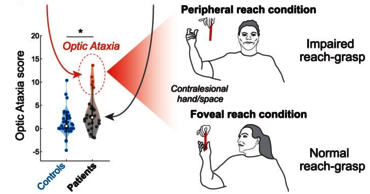 Lesions in the parietal cortex can strongly impair visually guided reach-grasping behaviour. A specific reaching deficit termed 'optic ataxia' (OA) occurs when eye and hand position are dissociated. OA has typically been studied in patients with lesions in the parietal cortex, neglecting potential thalamic contributions. Here, we examined 28 acute stroke patients (age 58.9 ± 12.6 years) with circumscribed thalamic lesions for the presence of OA. We leveraged MRI-based lesion-symptom mapping to address the contributions of specific thalamic nuclei to visually guided reaching deficits under foveal and peripheral viewing conditions. Based on the cortical literature, we hypothesized that lesions in thalamic nuclei with strong connections to the inferior and superior parietal cortex, such as the ventrolateral nucleus and pulvinar might lead to OA. In comparison with age-matched healthy subjects (n = 40, age 60.6 ± 9.1 years), we identified five thalamic patients with OA, most pronounced for reaches with the contralesional hand into the contralesional space. While motor and grasping deficits and OA occurred frequently together, they did not always co-occur, and visual attention deficits could not account for the OA either. Comparing the lesion maps of patients with and without OA, the critical lesion site for OA was not restricted to one circumscribed thalamic region within the Morel atlas. Instead, it encompassed several medial and lateral nuclei within and around the internal medullary laminar complex. Interestingly, this region matches the so-called central thalamus, a functionally defined thalamic region that is considered a 'higher-order' nucleus complex. It receives afferent inputs from the cerebellum and brainstem regions and connects to fronto-parietal regions involved in eye movement control. Taken together, our results suggest the critical importance of thalamic nuclei for the spatial transformation from eye- into body-centred coordinates.